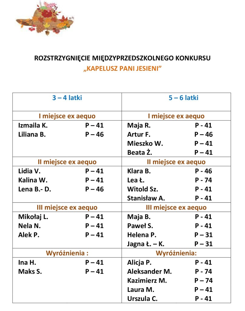 DZIĘKUJEMY ZA TAK LICZNY UDZIAŁ W MIĘDZYPRZEDSZKOLNYM KONKURSIE PLASTYCZNO-TECHNICZNYM "KAPELUSZ PANI JESIENI"!